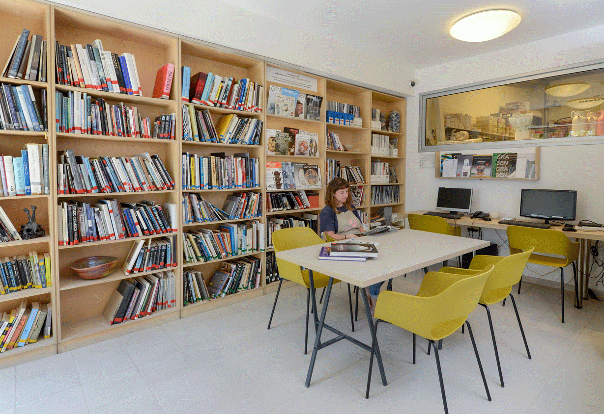 ספרי עיון (צהוב) / אוספים (אדום) / טכנולוגיה (ירוק) / אומנים (כחול) / היסטוריה (אפור) / אומנות (לבן) / אמנות כללית (אדום-לבן) / קרמיקה ישראלית (חום)
