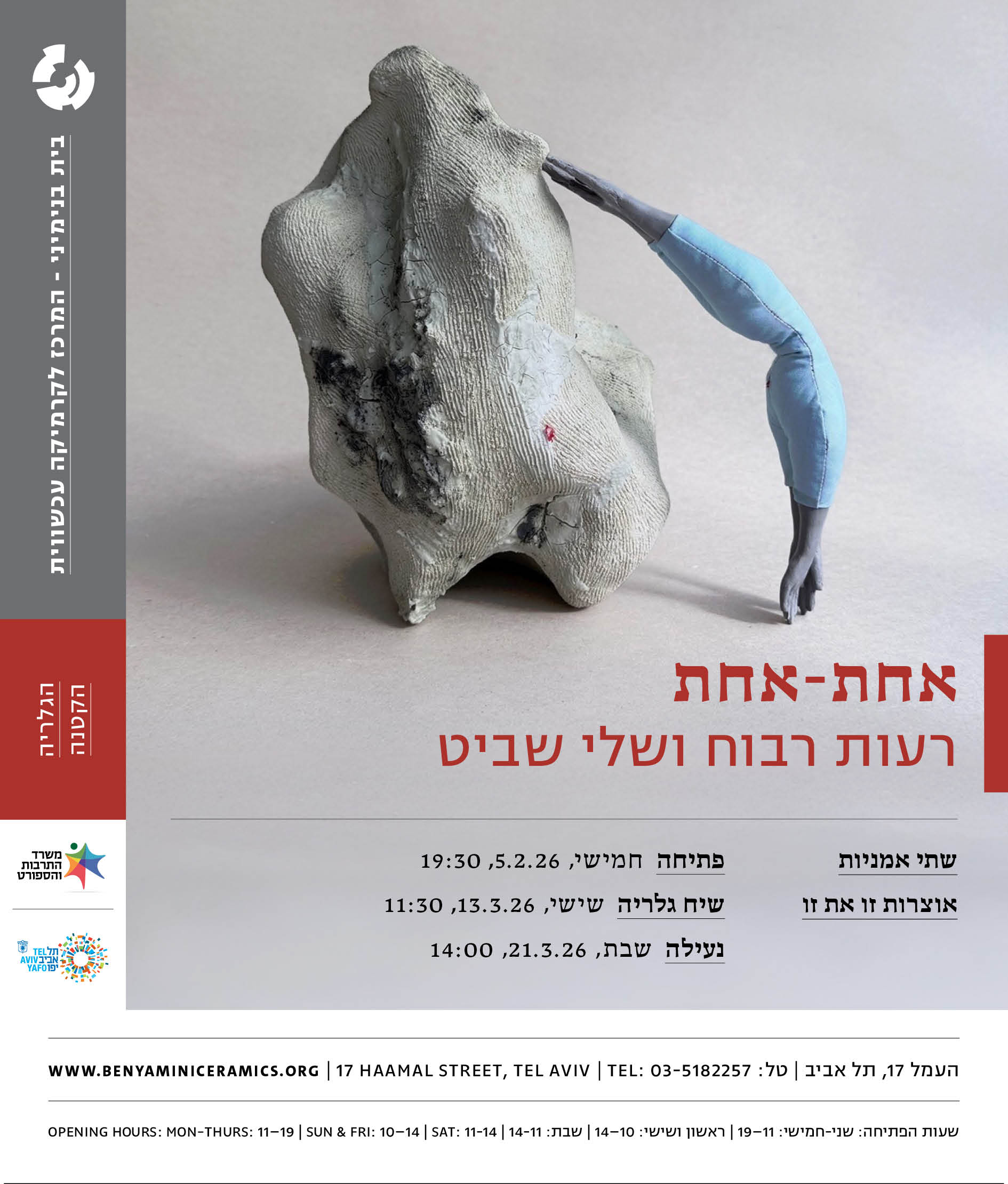התערוכה ״אחת-אחת״ של רעות רבוח ושלי שביט היא מפגש בין שתי אמניות שבו הגוף והחומר מהווים מרחב לבחינת זיכרון, הישרדות ונרטיבים בין־דוריים. היא בוחנת כיצד חוויות אישיות וחומריות—שכול, הגירה, אלימות, טראומה—מתגלמות בגוף, בנוף ובחפץ היומיומי, וכיצד הן מתורגמות ומשתנות בתוך מרחב תצוגה שבו האישי והחברתי פועלים בו זמנית.