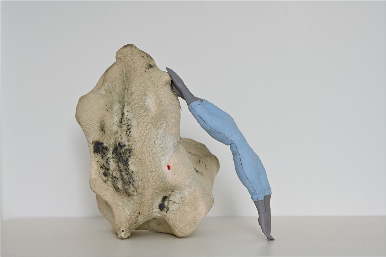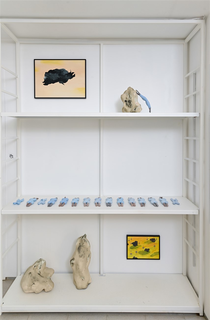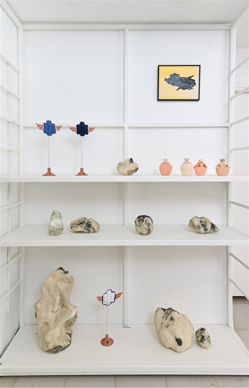 تعمل ريعوت ربوح انطلاقًا من إصغاء عميق للمادّة، ومن فضول تجاه الجسد المتواجد في حالة تحوّل مستمر. إلى جانب منحوتات خزفية عارية ومتشقّقة تُخلِّد أثر لمسة اليد، تعرض ربوح منجز أعمال ثنائيّة الأبعاد: لوحات تظهر فيها صخور بتدرجات اللون الأسود وشخصيّات تجرديّة بلا ملامح. اختيار نوعين من الألوان، الزيتيّة والمائيّة، يخلق لوحة لتدرجات ألوان تنقل إحاسيس متناقضة وملتبسة.