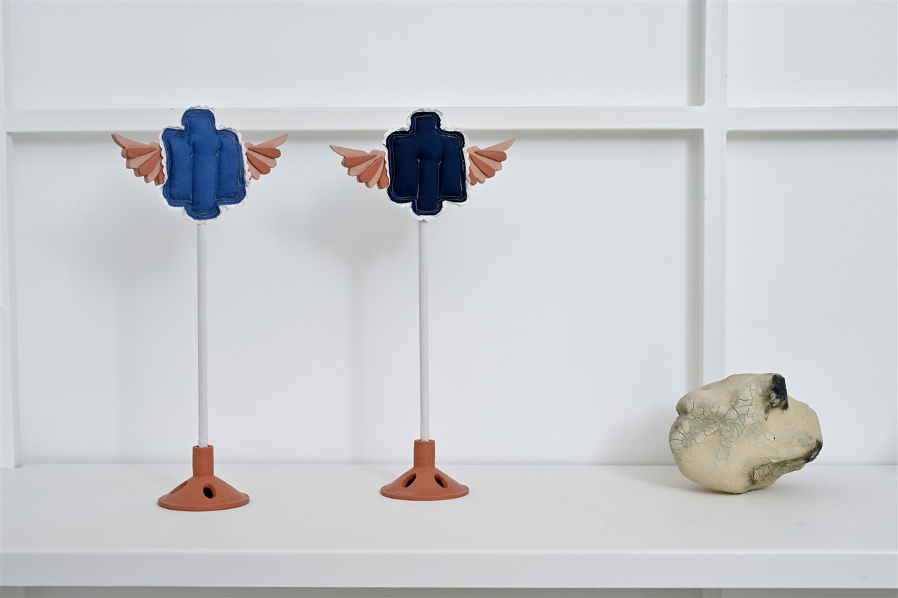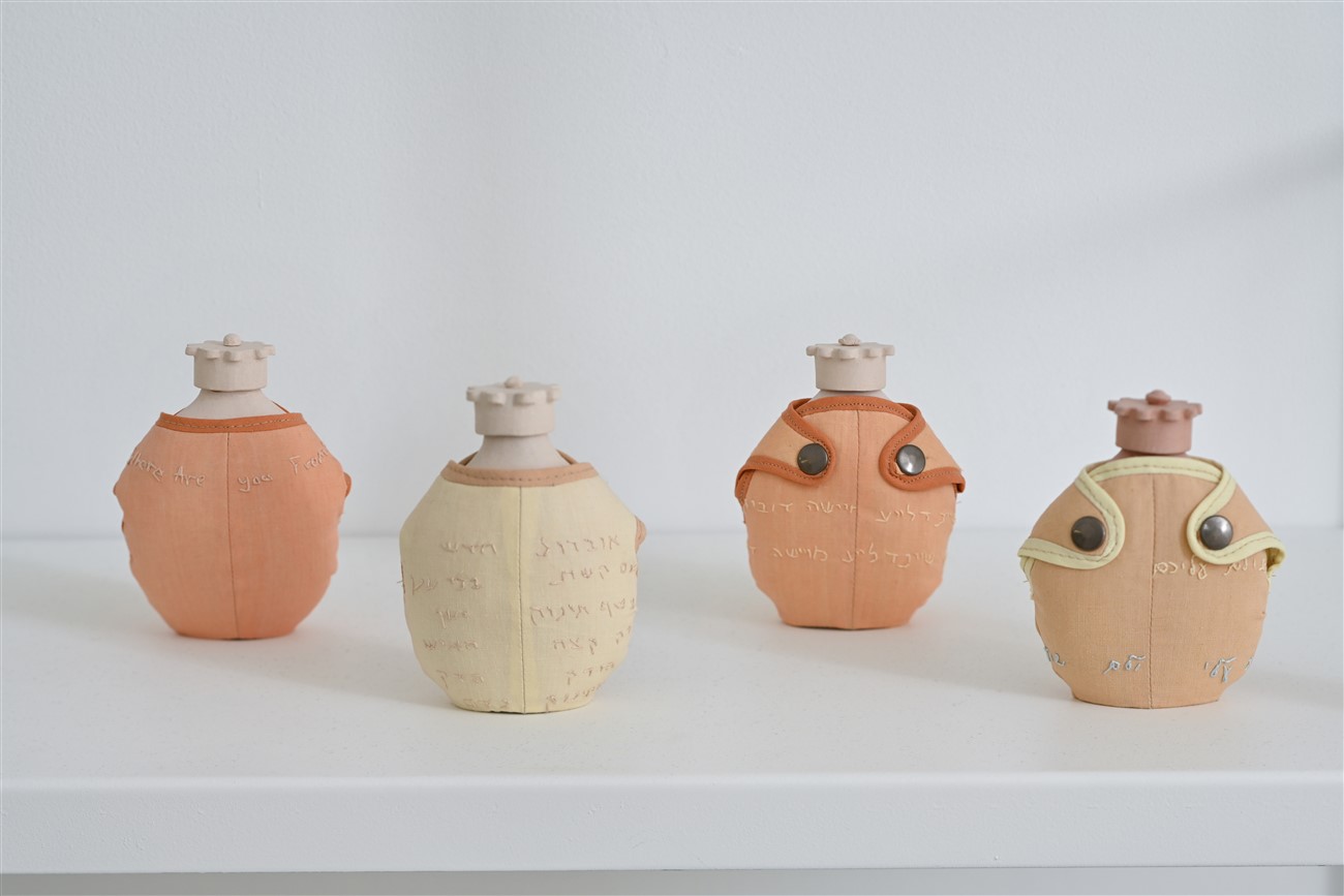 تتأرجح الأغراض التي تنتجها بين الجنديّة المنضبطة والمرأة الحالمة، بين بقاءٍ حذر وإبداعٍ حرّ. تستخدم شڨيط صورًا يوميّة ذات تعود إلى سياق عسكريّ، لكن الحضور المدنيّ يطبّع حالة صراع مستمر. تخرج الأغراض من سياقها وتتحوّل إلى قوالب نمطية: قبضات ناعمة ذات أجنحة من مادّة خزفيّة تتربّع على أعمدة من بالونات مقلوبة، وقارورة ماء عسكريّة حزفيّة للجيش الإسرائيليّ مصغّرة إلى حجم راحة اليد، ملفوفة بغطاء حراري مصنوع يدويًا ومطرّزة تطريزًا شخصيًا. هذا التصغير يقرّب الشحنة العسكريّة من الغرض الحميميّ دون أن يخفّف من حدّتها، ويجسّد كيف يتحوّل البقاء إلى مادّة يوميّة تُقبَل بوصفها طبيعية وعادية.